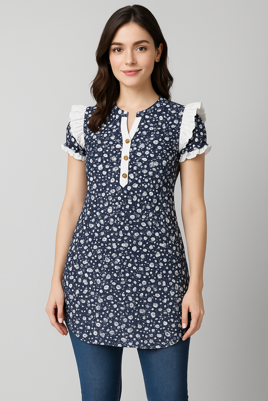 Add a touch of elegance with this Vairaagee party & casual floral printed navy blue ladies top. Styled with delicate white floral prints, smart button-down design, and ruffled sleeve detailing, this top blends modern charm with everyday comfort.
